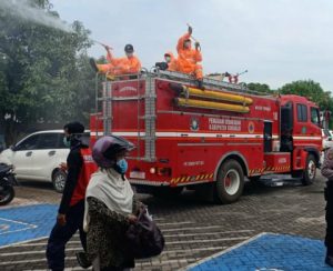 Satu unit truk damkar berisi disinfektan, diterjunkan untuk melakukan pencemprotan gerbang Mako hingga ke seluruh sisi luar.