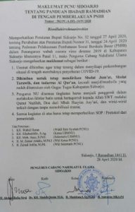 Bagaimana tidak, maklumat NU yang dikeluarkan pada tanggal 28 April 2020 itu, menghimbau kepada ummat untuk tetap mendirikan sholat Jum’at, Sholat Tarawih dan Tadarus Al Qur’an di masjid, kecuali masjid yang sudah ditentukan oleh gugus tugas Kabupaten Sidoarjo.
