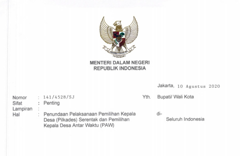 Dalam surat bernomor 141/4528/SJ yang ditandatangani Senin, 10 Agustus 2020, diperintahkan pada Gubernur untuk menunda semua rencana Pilkades dan penggantian Kepala Desa Antar Waktu (PAW) selesainya Pilkada yang rencananya akan digelar 9 Desember 2020 mendatang.